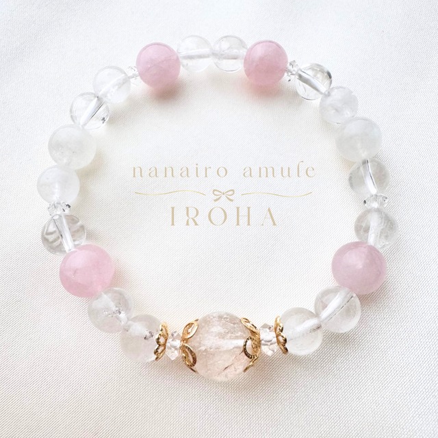 彩り豊かな天然石が 華やかな未来へ導く あなたの毎日を照らす 希望の光となりますように nanairo amule のお守りブレスレット IROHA ⚘* 柔らかなピンクと光の輝きがあなたの中に眠る愛と美しさを優しく呼び覚ます 持ち主の波動を高め、明るい未来への扉を開いてくれるブレスレットです ✧ 心を癒し、再び笑顔で未来へ進む力を与えてくれる ✧ 新しい一歩を踏みだしたい ✧ 感情の波を整え、穏やかな毎日を過ごしたい ✧ 心を解きほぐし、自己愛を育む ✧ 出会いのチャンス、良縁を引き寄せる ~* 天然石 *~ 8mm ローズクォーツ 3A レインボームーンストーン 3A ヒマラヤ水晶 マニカラン産 10mm ピンクアイリスクォーツ ~*サイズ *~ 内径 約 15.5 cm サイズ変更可 ※他の店舗でも販売しております ひとつひとつハンドメイドで制作しておりますので、石の色味やデザインに個体差があることをご了承ください ※金属部分にはアレルギーが起こりにくいといわれる素材を使用しています(ステンレス製)がすべての方にアレルギーが起こらないことを保証するものではありません。 体質や体調により、まれにかゆみ・赤みなどの症状が出る場合がございます。その際はすぐに着用を中止し、専門医にご相談ください。 ※金属部分を水晶ロンデルに変更も可能です。 ~✼ 天然石のお取扱いについて ✼~ 天然石の種類により、水や熱(日光)に弱いものもございます。就寝時や入浴、温泉、プール、海水浴、サウナ等での着用はお控えください。また、衝撃を与えると割れたり、欠けたりする場合もございます。着用時は十分ご注意ください オペロンゴムを使用しております。強く引っ張りますと劣化を早める原因となりますので、ご着用の際はお気をつけください