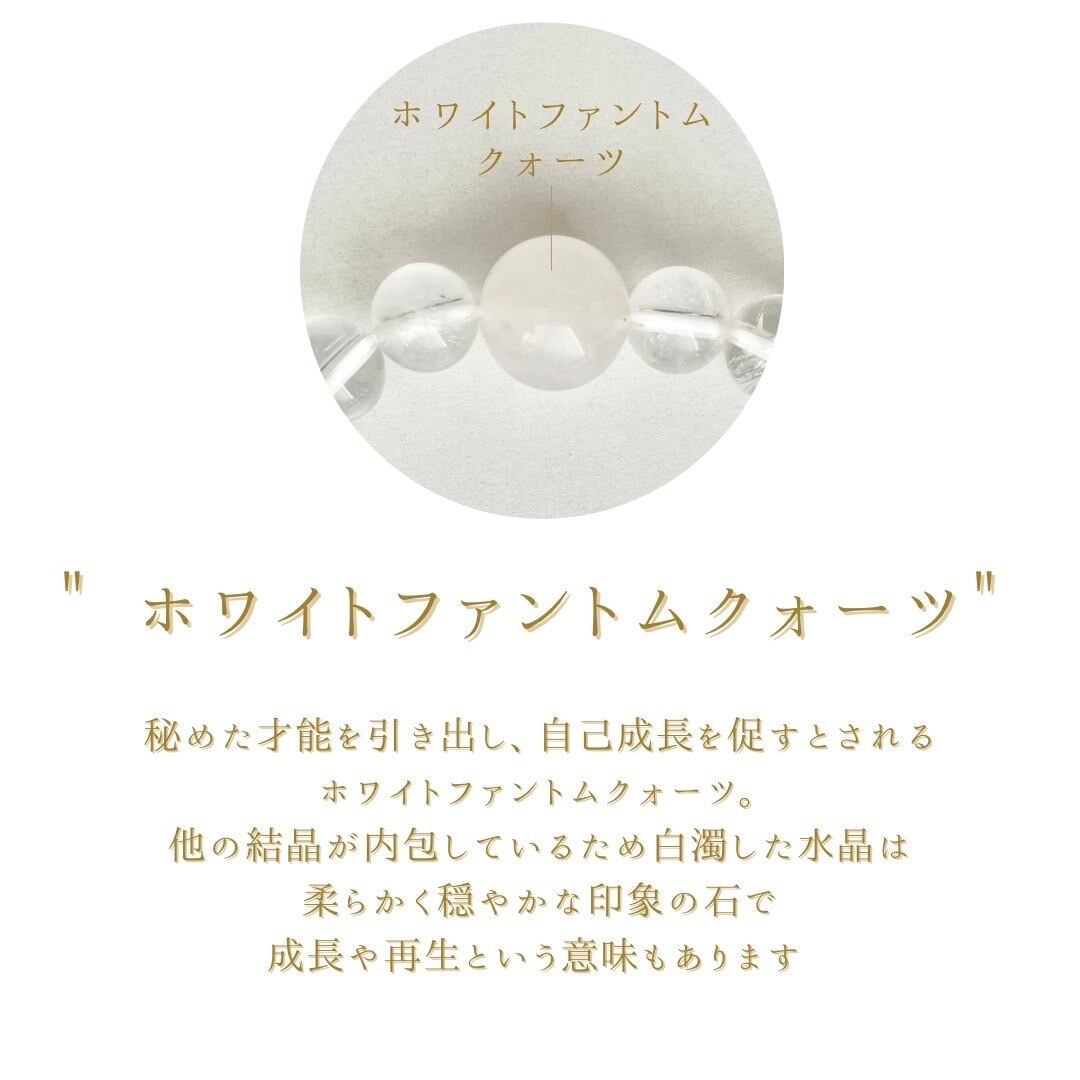 秘めた才能を引き出し、自己成長を促すとされるホワイトファントムクォーツ。他の結晶が内包しているため白濁した水晶は、柔らかく穏やかな印象の石で、成長や再生という意味もあります
