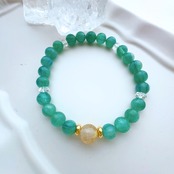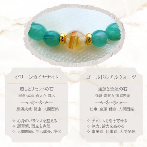 心を豊かにするエネルギーを持つ『グリーンカイヤナイト』、金運を高めると言われる『ゴールドルチル』、そして浄化の象徴『水晶』の天然石が使用されています✧゜